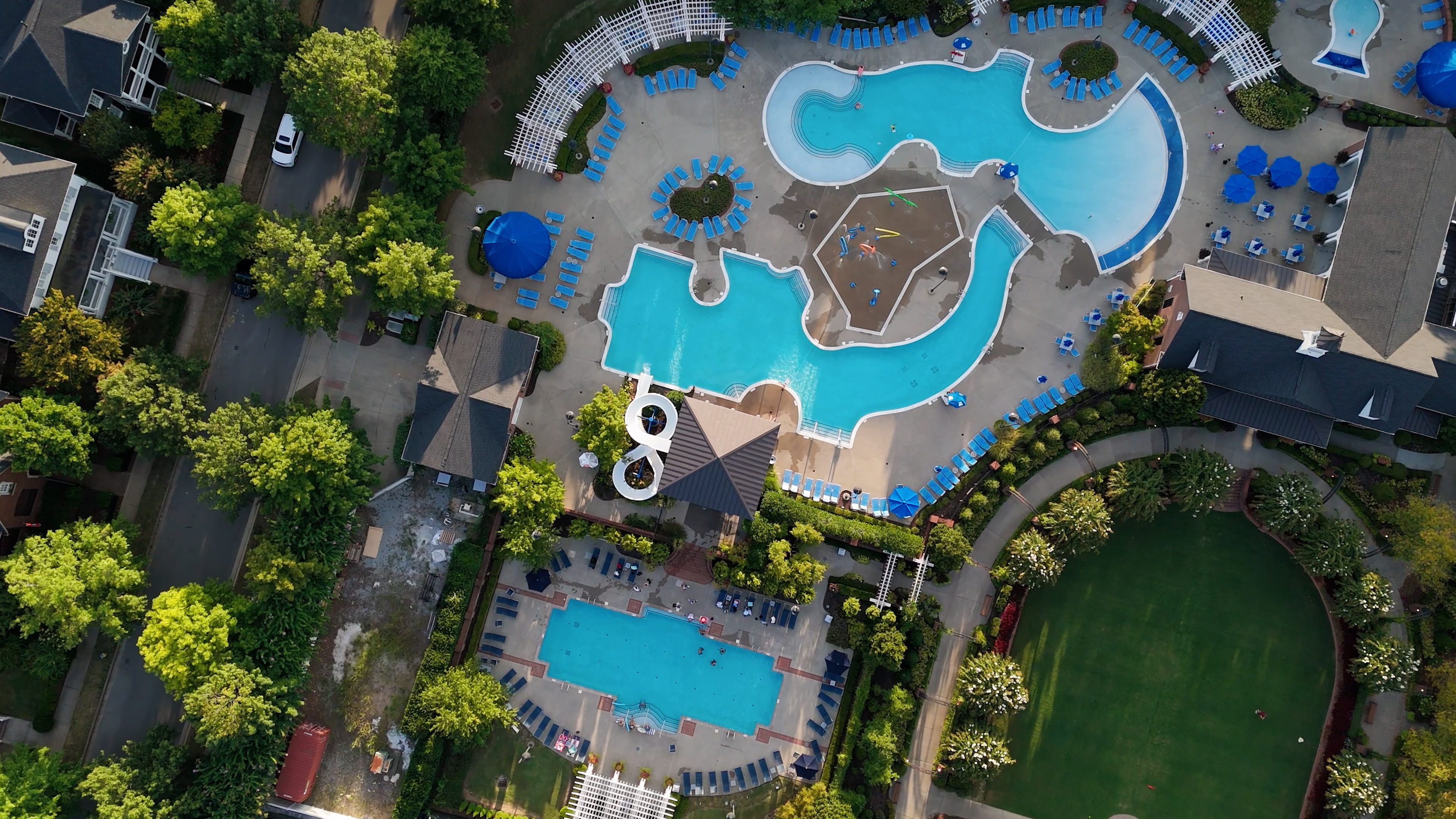 At the heart of the community is a 15,000 square foot Residence Club. Inside you'll find a fully equipped fitness center, a 37-seat movie theater-style room, and drop-in daycare. Outside, the resort-style pools are the real showstopper — including a 119-foot water slide and a lazy river. Big hit with the kids. Big hit with the adults, too.